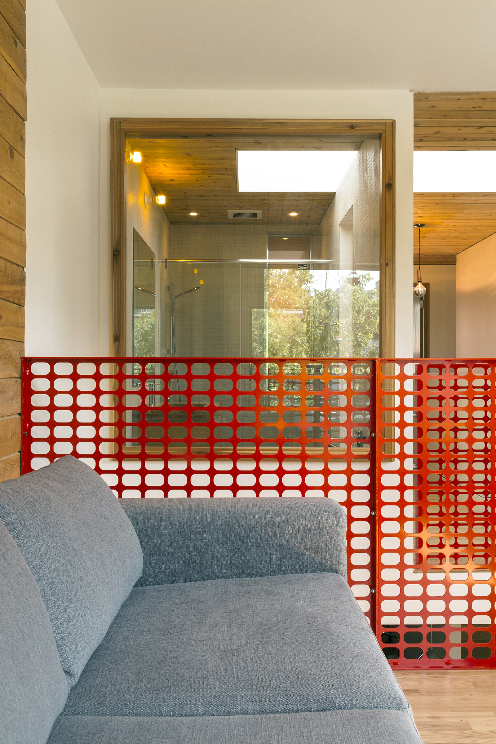 On accède au bureau par une passerelle en acier orange qui organise la double hauteur ayant vue sur la salle à manger.